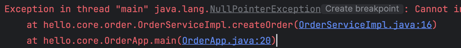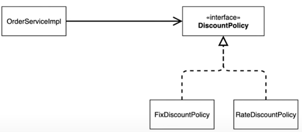 DIP: 주문서비스 클라이언트(OrderServiceImpl)은 'DiscountPolicy' 인터페이스에 의존하여 DIP 원칙을 지킨것 같은데?