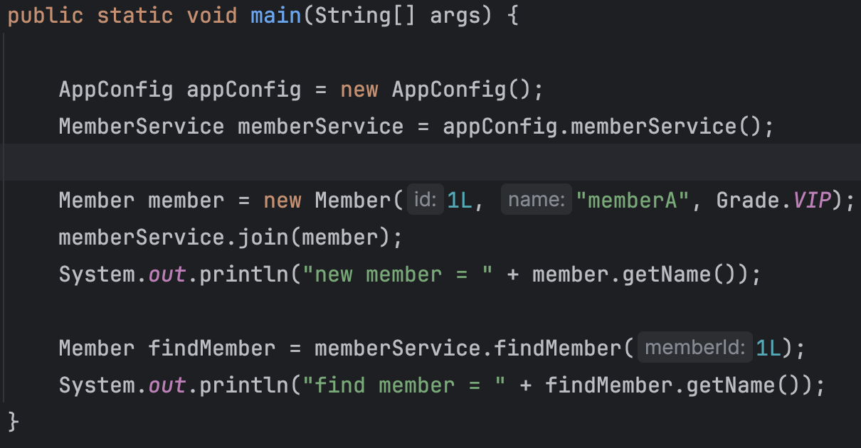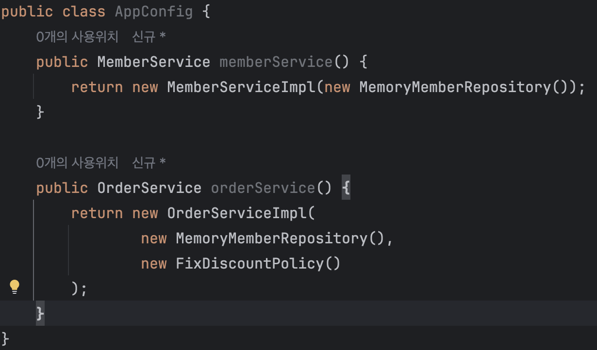 생성자 주입 방식을 통해 AppConfig에서 (위 코드를 따르면) 누군가가 MemberService, OrderService를 호출하면 new를 통해 구현체를 주입을 시켜주는 것이다.