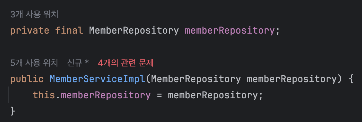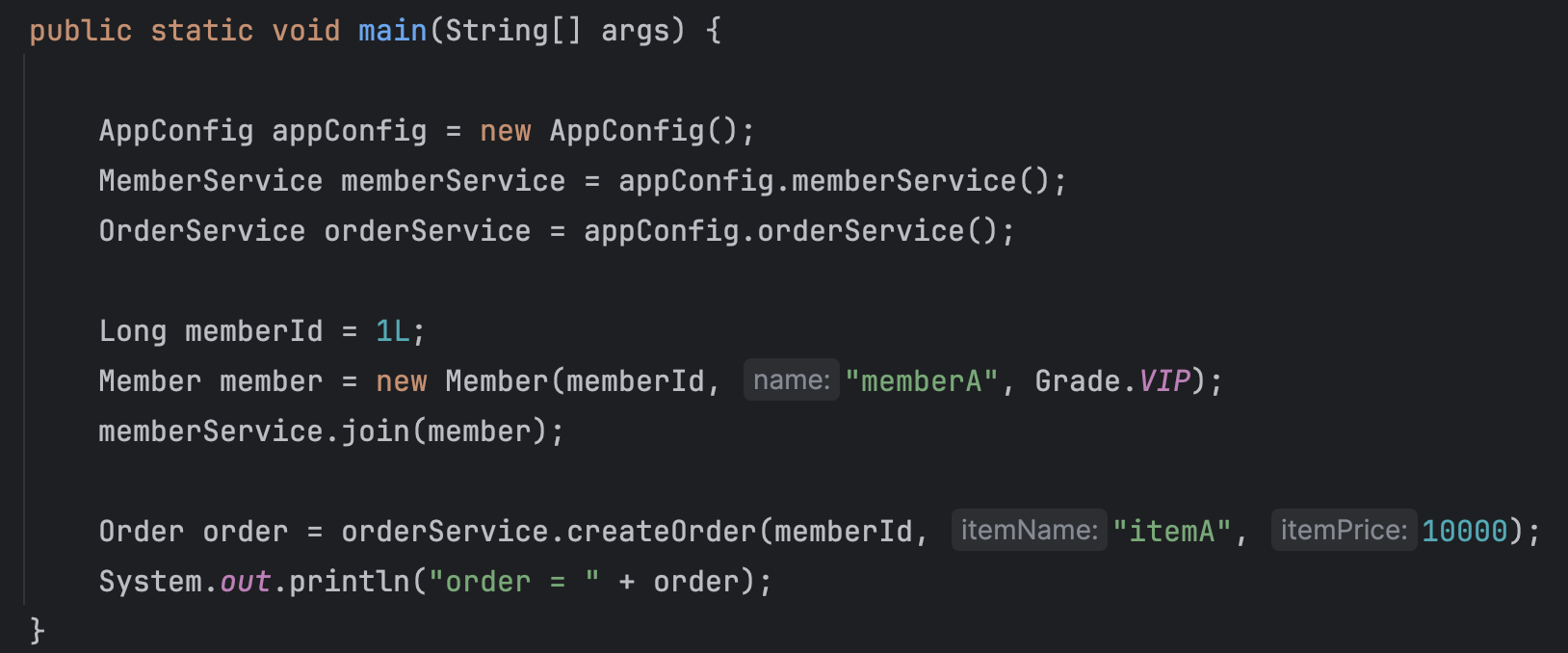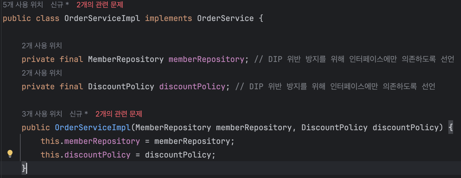 클라이언트 코드인 OrderServiceImpl에서 private final로 선언을 하고 값은 기본 생성자에서 할당을 해주는 것이다.