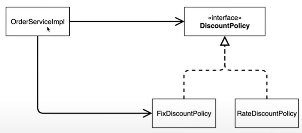 - OrderSerivceImpl -> MemoryMemberRepository, FixDiscountPolicy