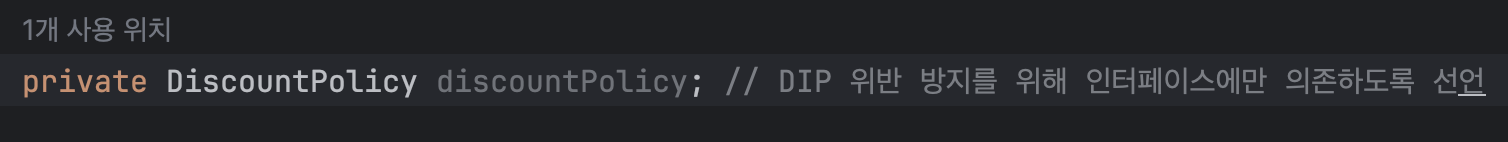 - 추상(인터페이스) 의존: DiscountPolicy