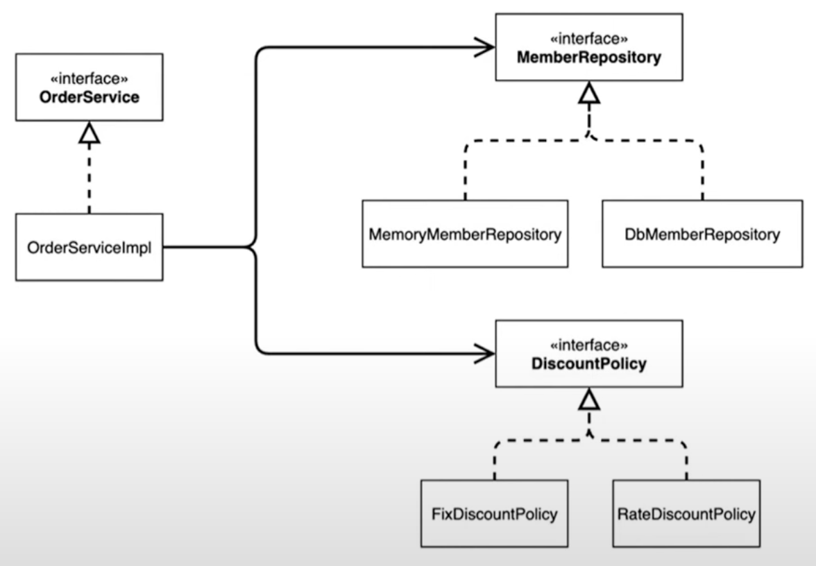 OrderServiceImpl에서는 MemberRepository, DiscountPolicy에 의존하는 것을 알 수 있다.