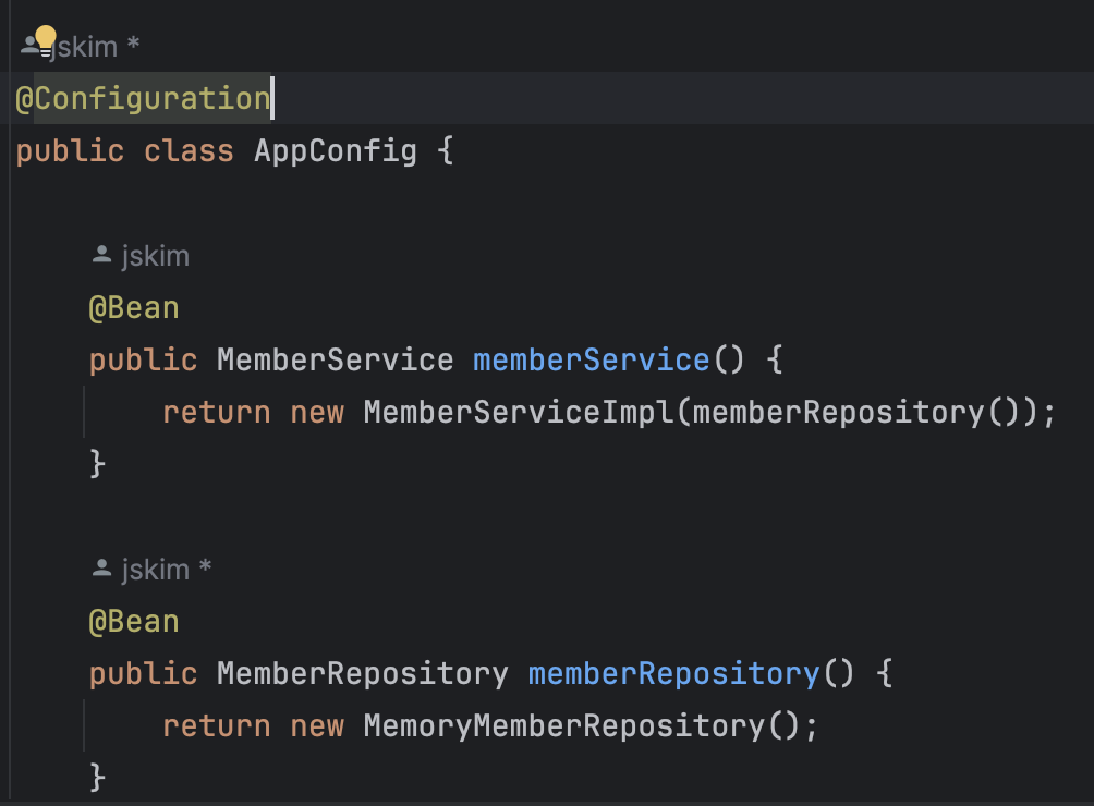 @Configuration, @Bean이 추가된 것을 볼 수 있다.