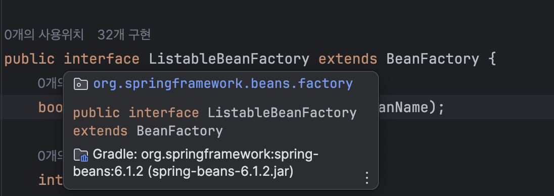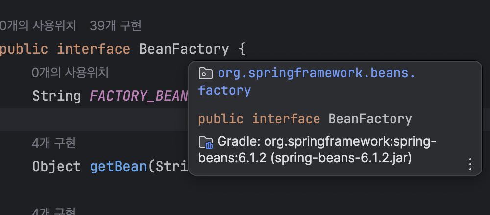 이렇게 최상위 인터페이스는 BeanFactory인 것을 볼 수가 있다.