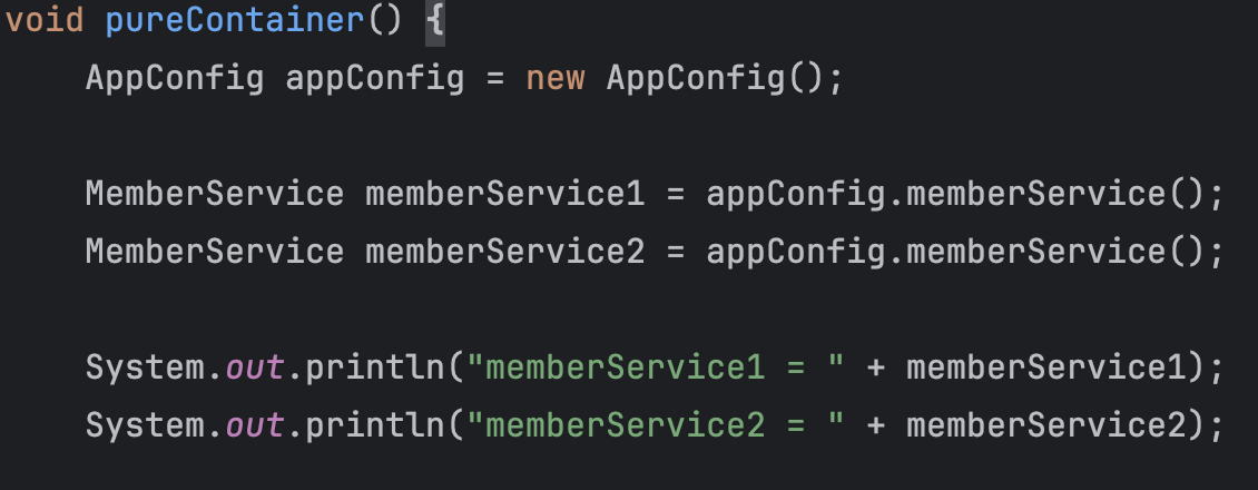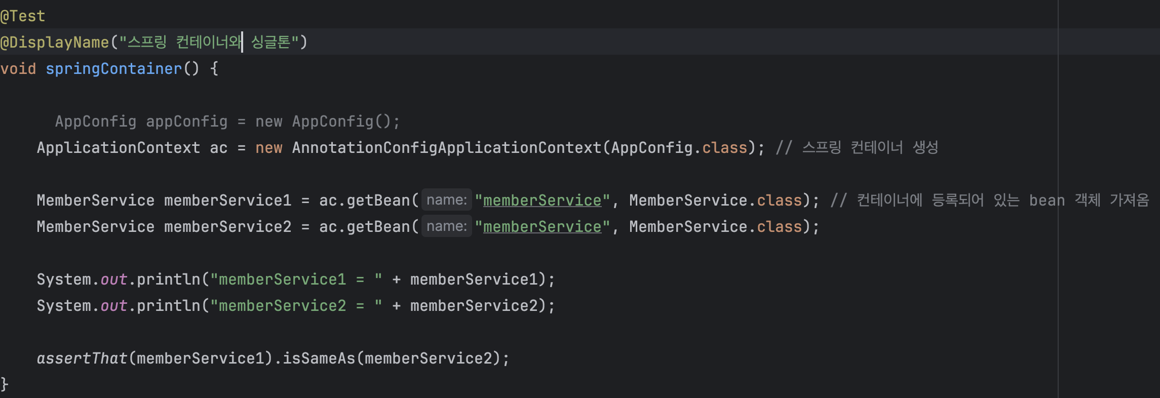 단순히 new AppConfig 생성해서 객체를 가져오는 것이 아니라 ApplicationContext 즉, 스프링 컨테이너를 생성하고 스프링 컨테이너에 등록되어 있는 bean(객체)를 가져와서 soutv를 찍어보고 과연 memberService1, 2는 같은지 isSameAs() 테스트를 해보자.