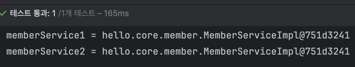 memberService1, 2는 모두 같은 memberServiceImpl객체를 같은 메모리 값으로 참조하고 있는걸 확인할 수 있다.