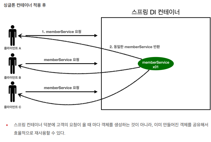 몇개의 요청이던, 단 1개의 동일한 memberService를 반환시킬수 있다.
