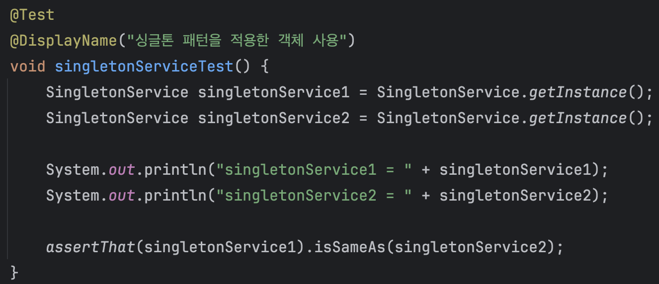 JUnit의 isSameAs() 메서드를 사용해서 과연 내가 생성한 singletonService1, 2가 과연 같은 인스턴스를 갖고 있는가를 검증해보자.