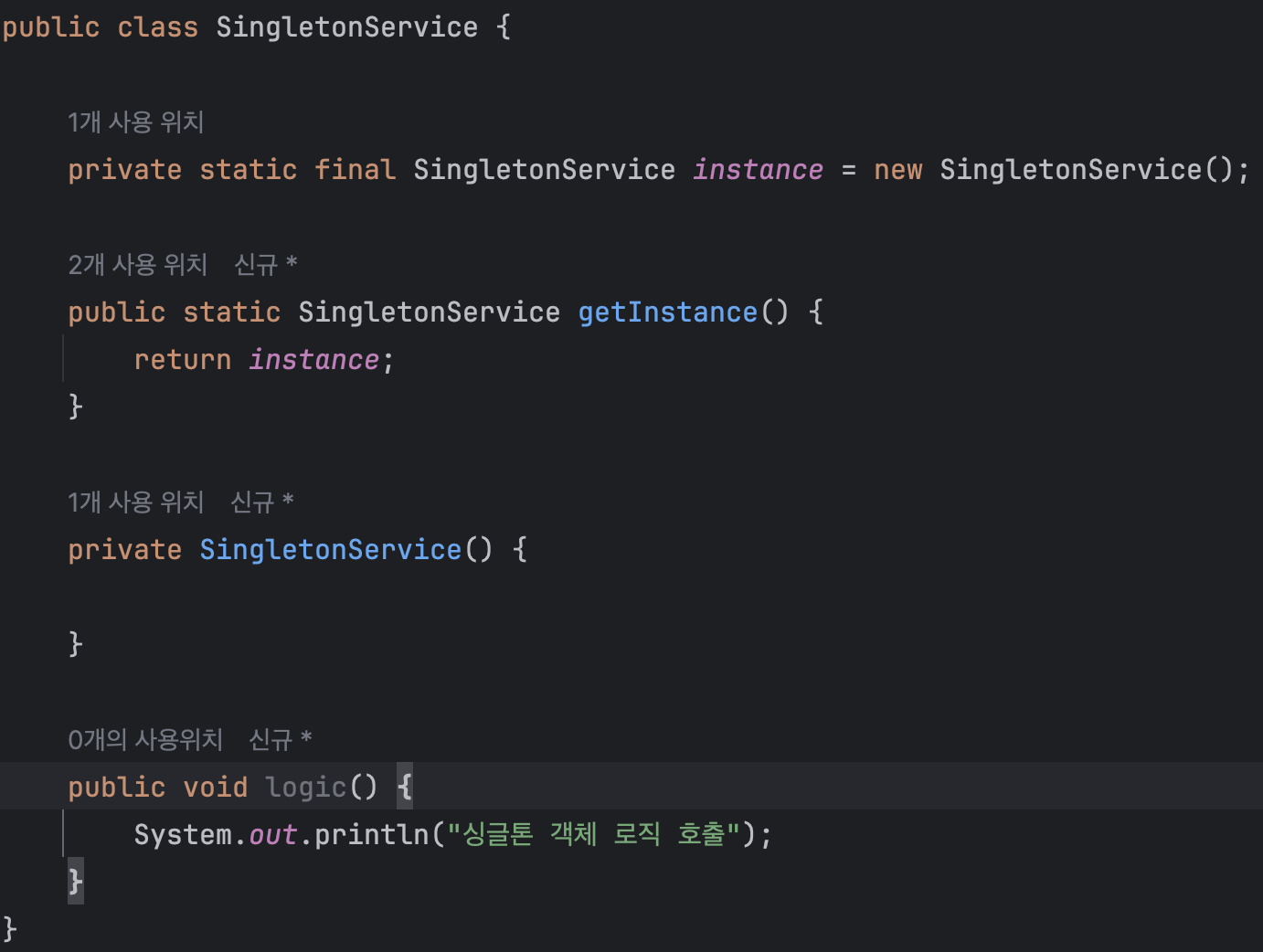 - 해당 객체 인스턴스가 필요하면 오직 getInstance() 메서드를 통해서만 접근 할 수 있다. 해당 메서드를 호출하면 항상 같은 인스턴스를 반환한다.