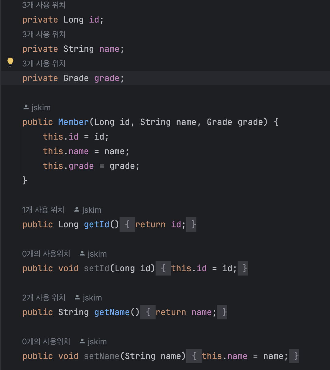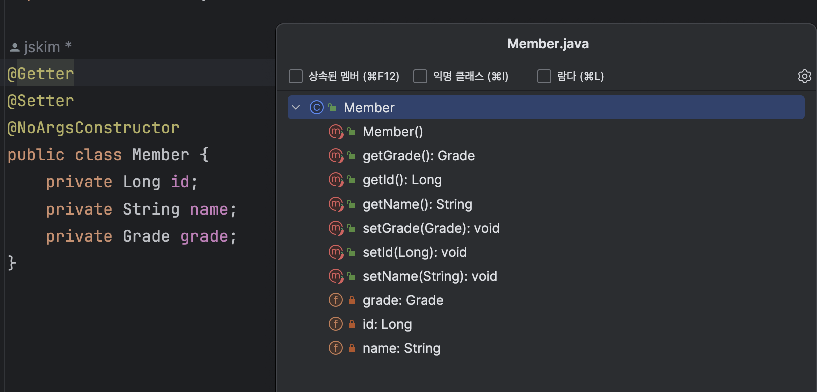 Member() - 기본생성자, getXxx() - 게터, setXxx() - 세터가 다 만들어져 있는 것을 볼 수 있다.