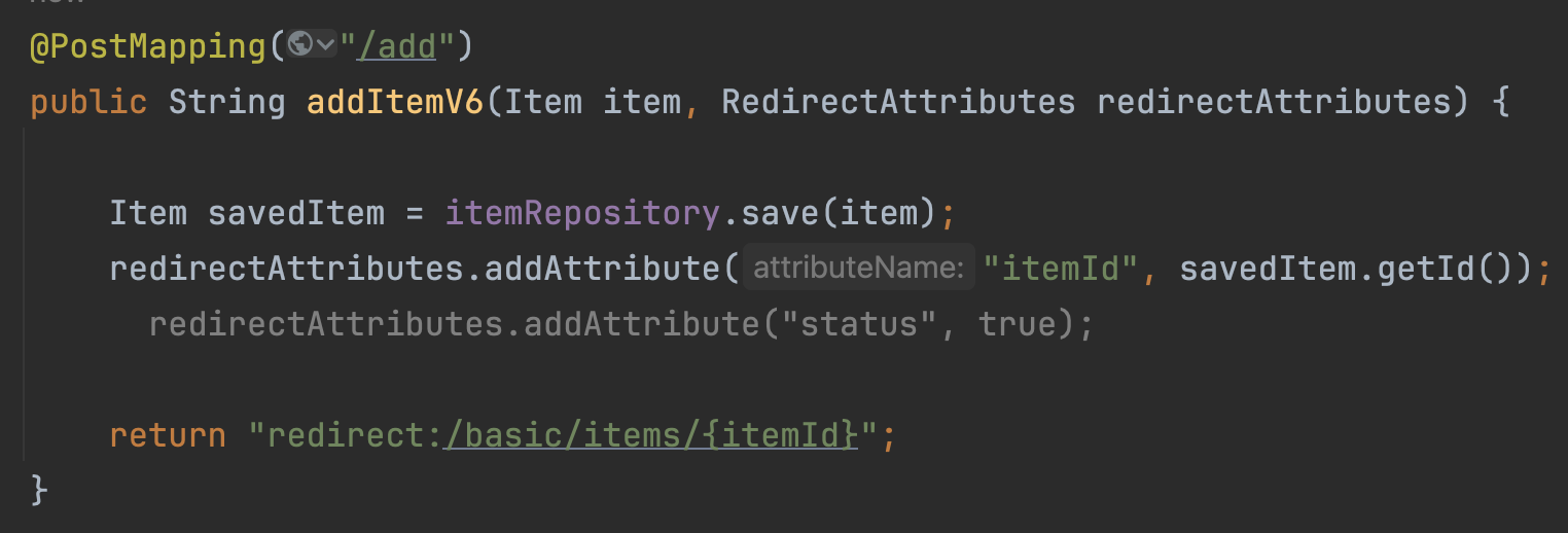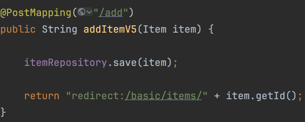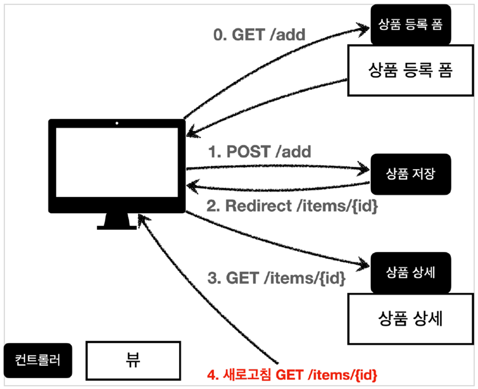 - 저장이 처리가 되면 기존과 다르게 Redirect를 하고 /items/{itemId}를 호출한다.