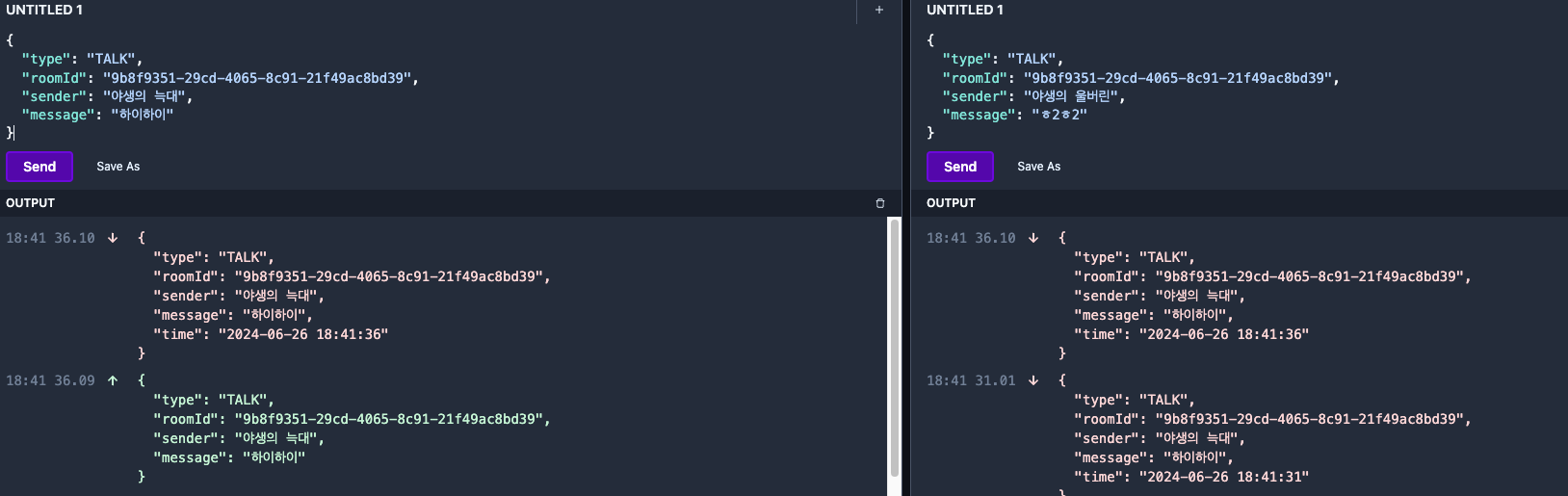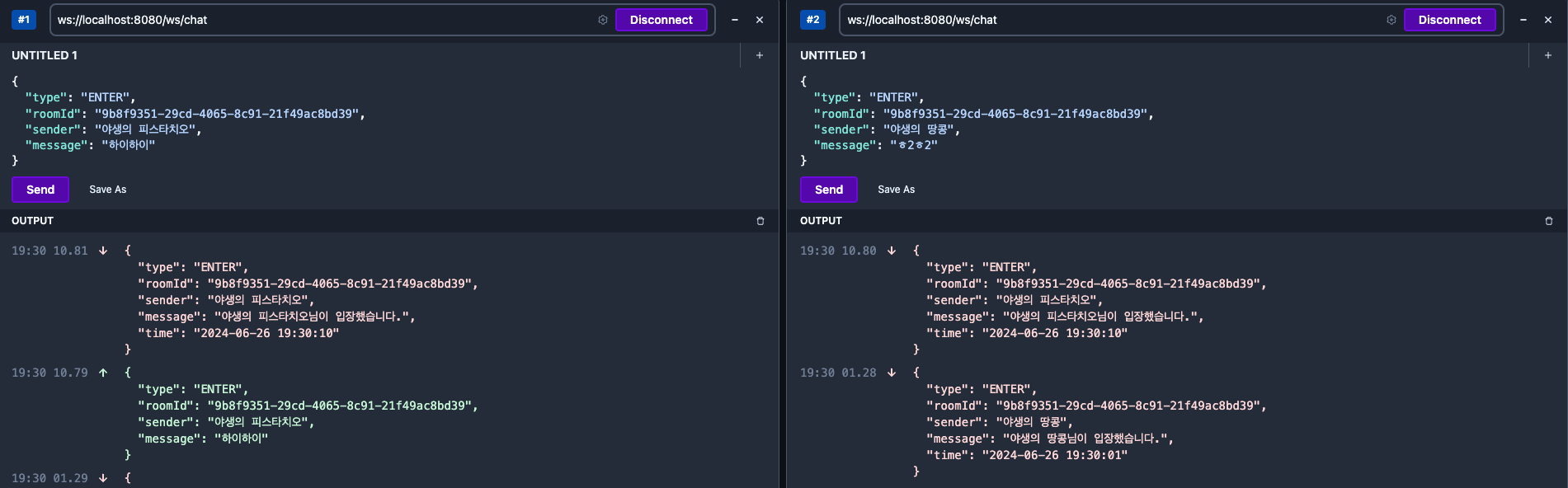 이렇게 클라이언트를 2개를 띄워서 양방향으로 통신을 확인해보면, 유저가 입장할 때 {userName}님이 입장했습니다. 라는 로그와 함께 방 입장이 완료된다.