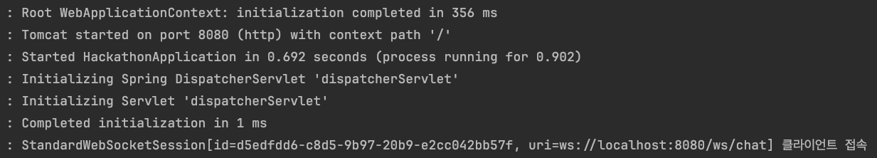 클라이언트에서 우리 웹 소켓에 커넥션을 요청하면 이렇게 접속한 유저 고유 세션 ID와, 접속 uri가 나오게 된다.