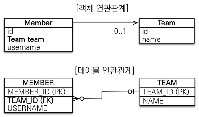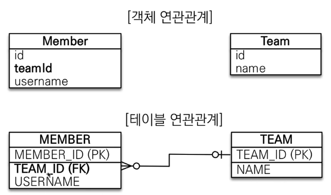 멤버를 가져오려면 member.getId()로 조회를 해서 멤버를 찾아온다. 근데 찾아온 멤버가 어느 팀 소속인지 알려면, 찾아온 멤버의 getTeamId()를 가져와서 변수에 저장한 후 해당 teamId로 team 객체에서 찾아 와야 한다. 이것부터 테이블과 객체 사이에는 이렇게 간격이 차이가 나게 된다.