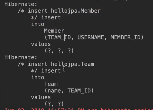이부분이 JPA를 사용할 때 가장 많이 하는 실수이다. 지금 이 코드는 연관관계의 주인(member)에 데이터를 넣은게 아니라, team(가짜매핑)에 데이터를 넣었다. 그렇기에 연관관계 지정이 되지 않고 서로다른 insert 쿼리가 2개가 나가게 된것이다.