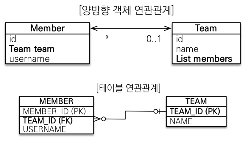 객체의 양방향 관계는 양방향 관계가 아니라 서로 다른 방향 관계가 2개 있는 것이다. 객체를 양방향으로 참조하기 위해서는 단방향 연관관계를 2개를 만들어야한다.