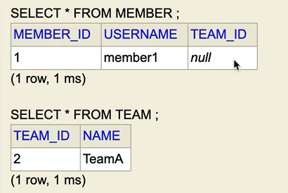 분명 insert 쿼리가 2번이 나갔고, 디비안에 결과를 보자. teamId가 왜 null이지? (연관 관계가 성립되지 않았다.)