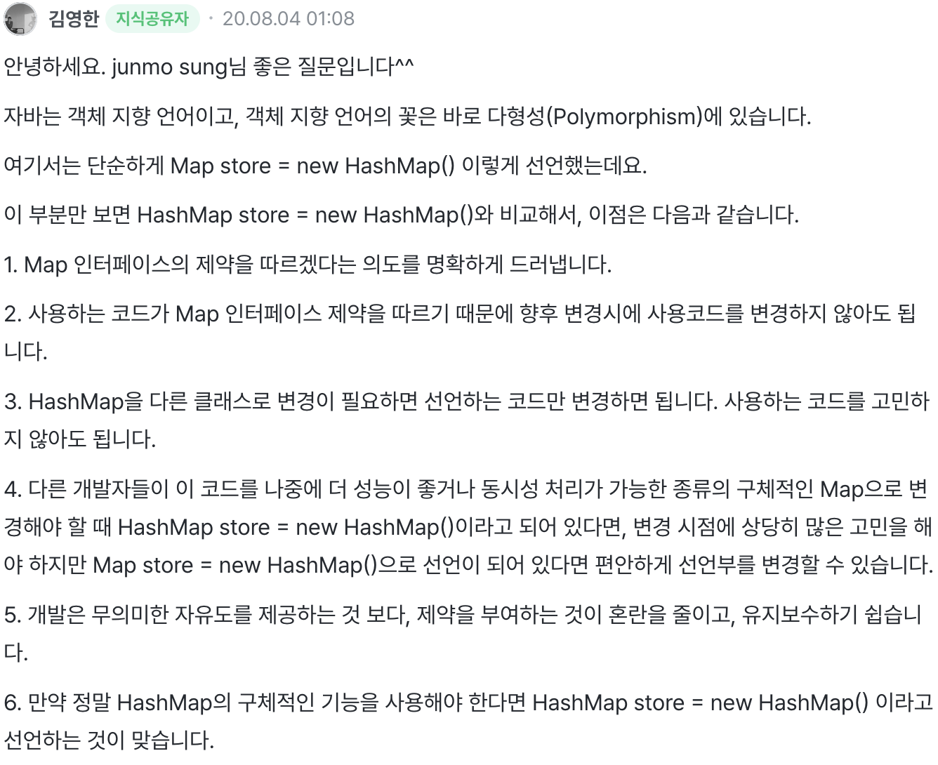 - Map 형태로 선언한 경우 언제든 다른 구현체로 변경할 수 있다. 객체지향스럽게, 변경에 용이하게 하는 것이다.